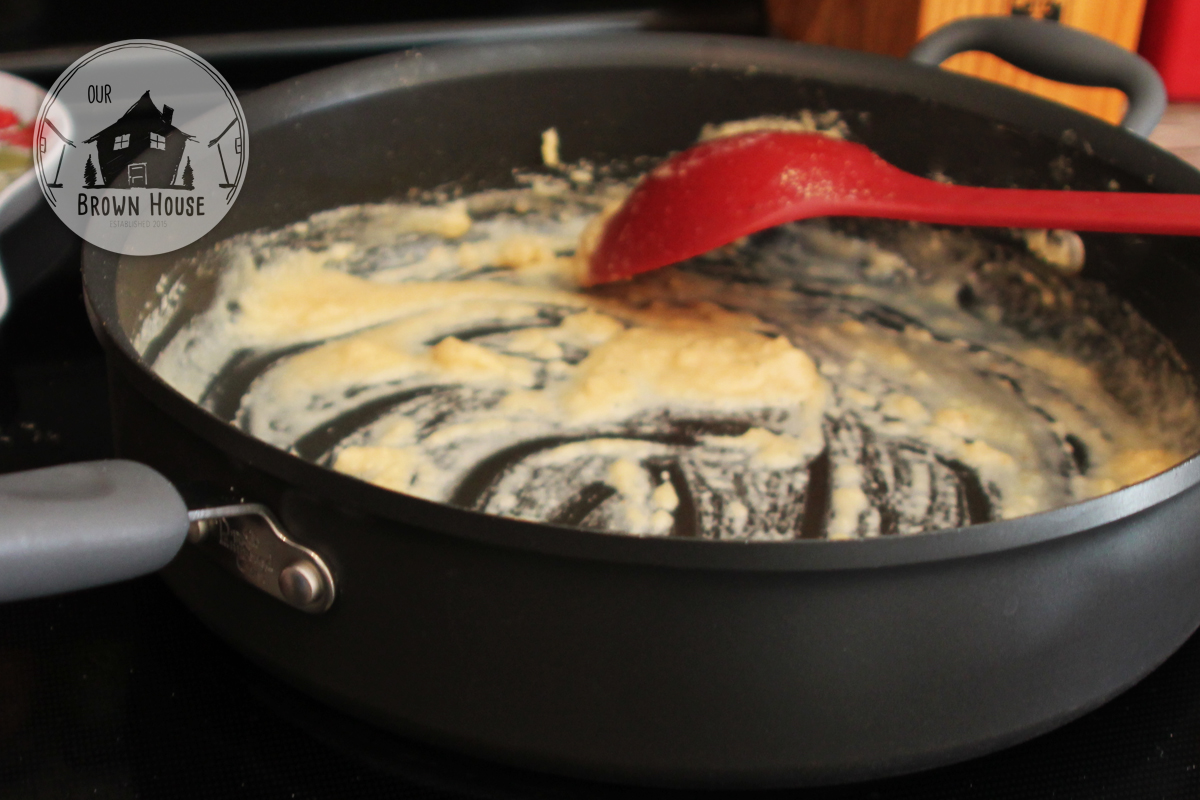 - Melt the butter in the same pan on medium heat. Add the flour to the butter and whisk until a paste forms. Let this cook until lightly browned, about 2-3 minutes, whisking regularly.