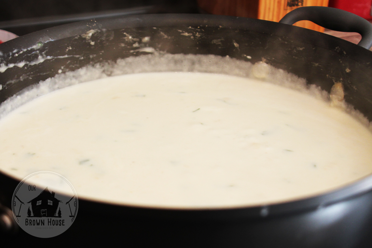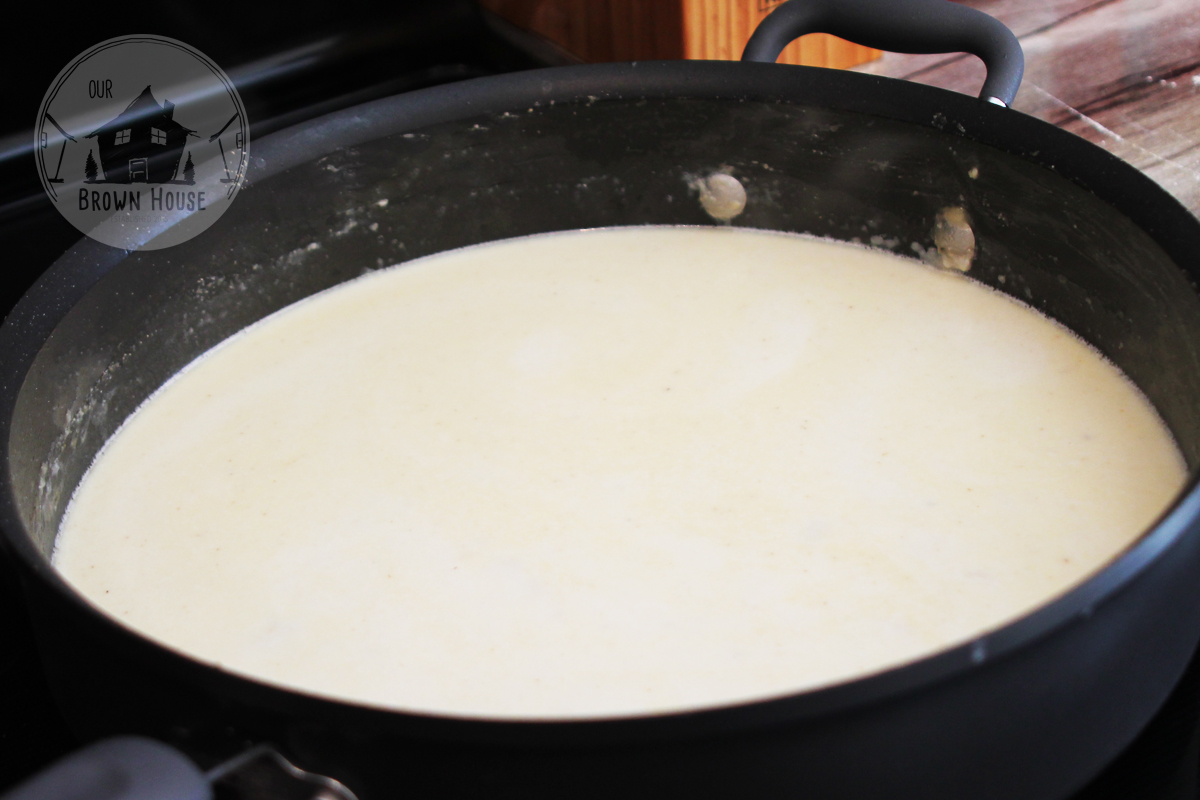 - Slowly whisk in chicken broth and milk, and cook, whisking regularly, about 2-3 minutes.