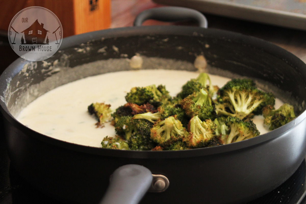 Add the roasted broccoli and chicken and season with a little more salt and pepper if it needs it. Serve however you want – over pasta, spaghetti squash, zoodles, or in zucchini lasagna!
